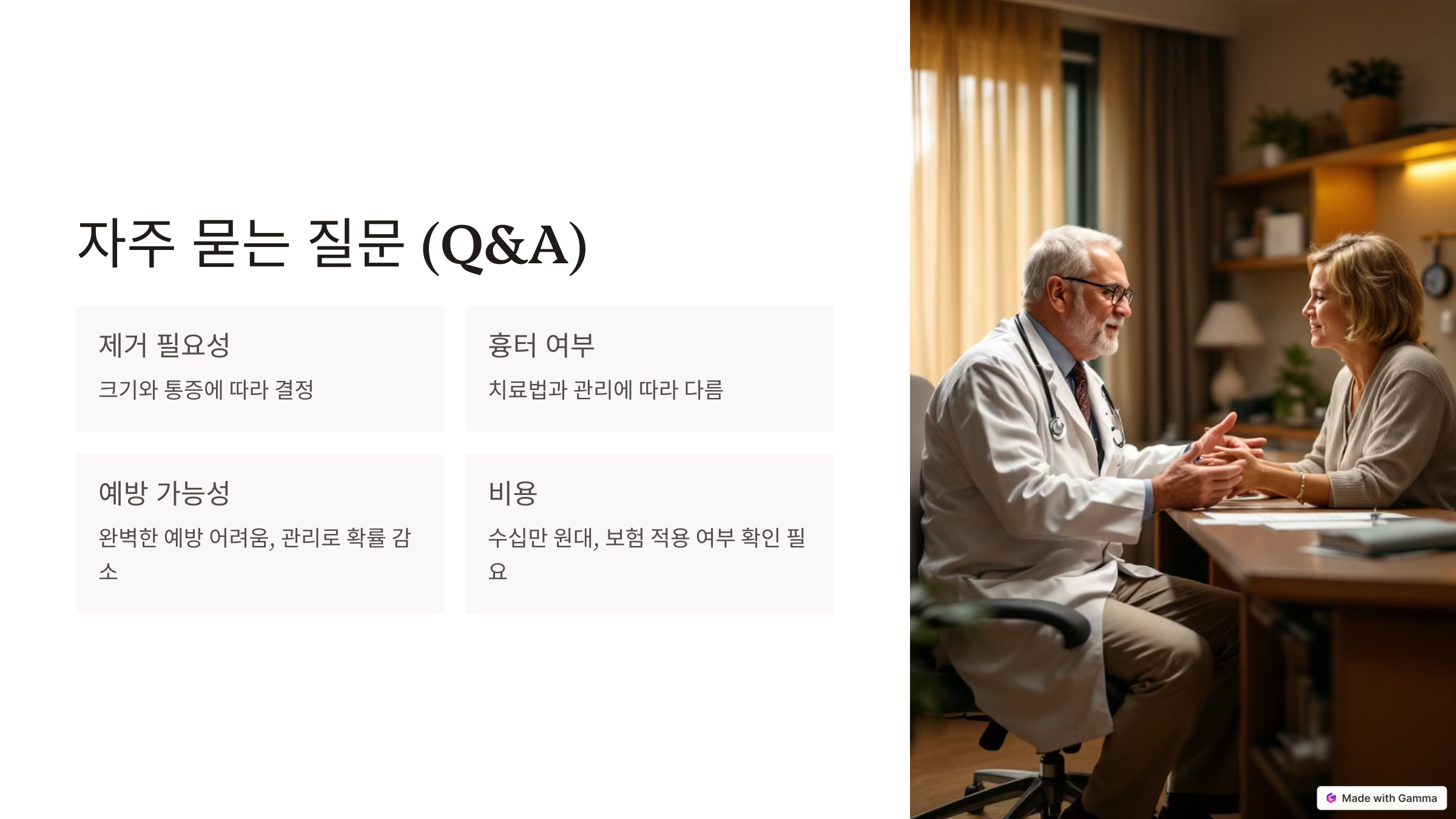 A: 크기가 작고 통증이 없는 경우 반드시 제거할 필요는 없습니다. 하지만 미용상 문제나 염증이 있을 경우 제거하는 것이 좋습니다.