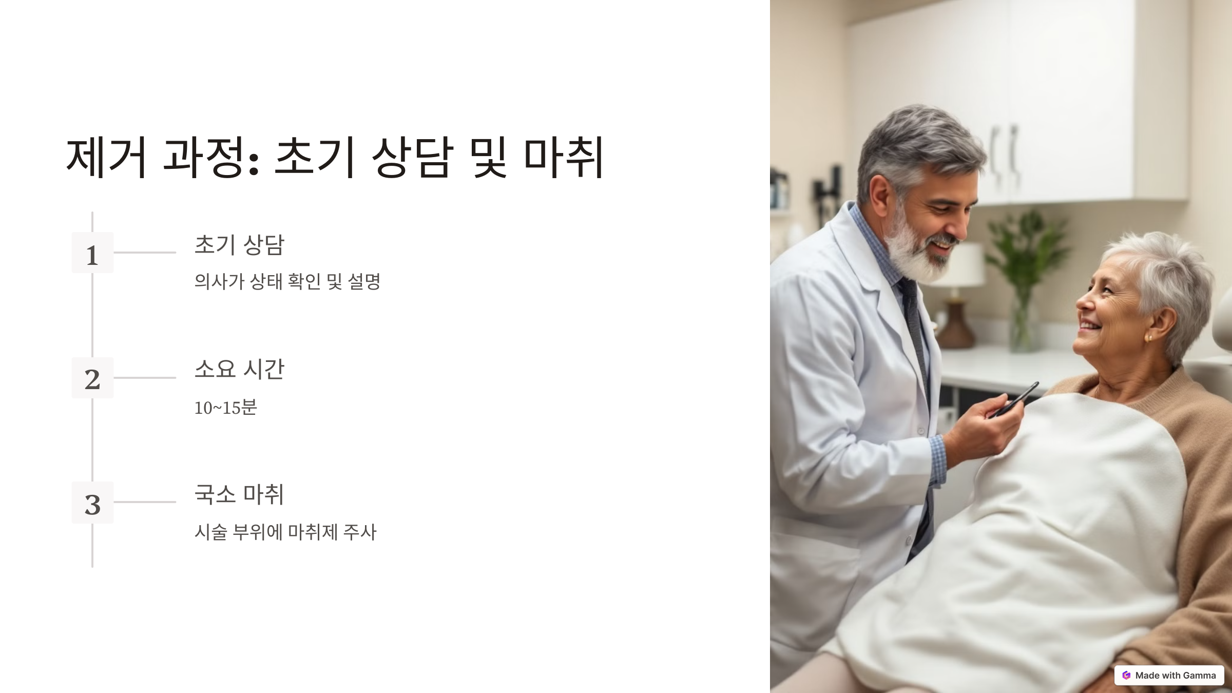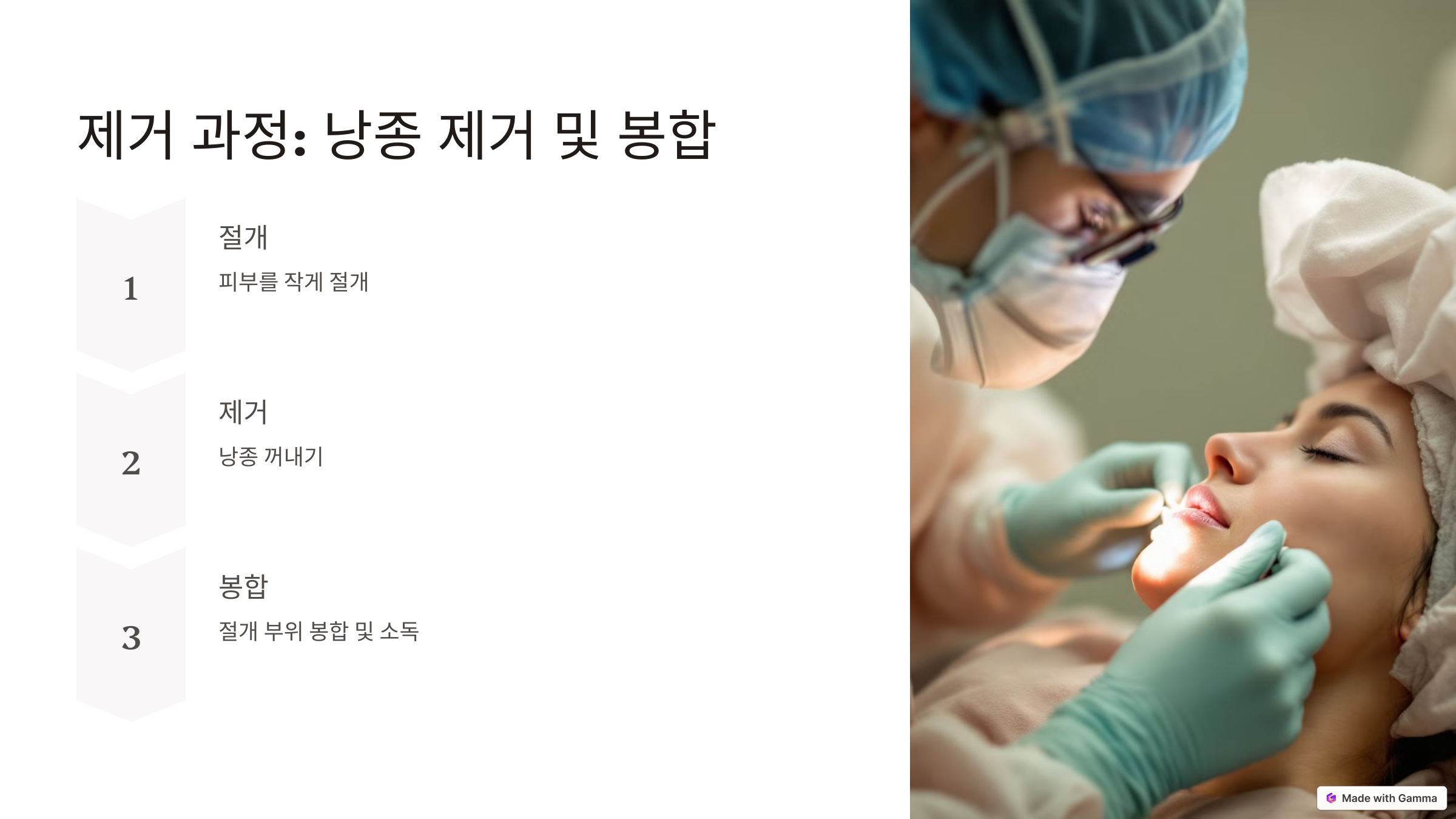 피지낭종 제거는 간단한 시술로 진행되며, 대개 다음과 같은 단계로 이루어집니다: