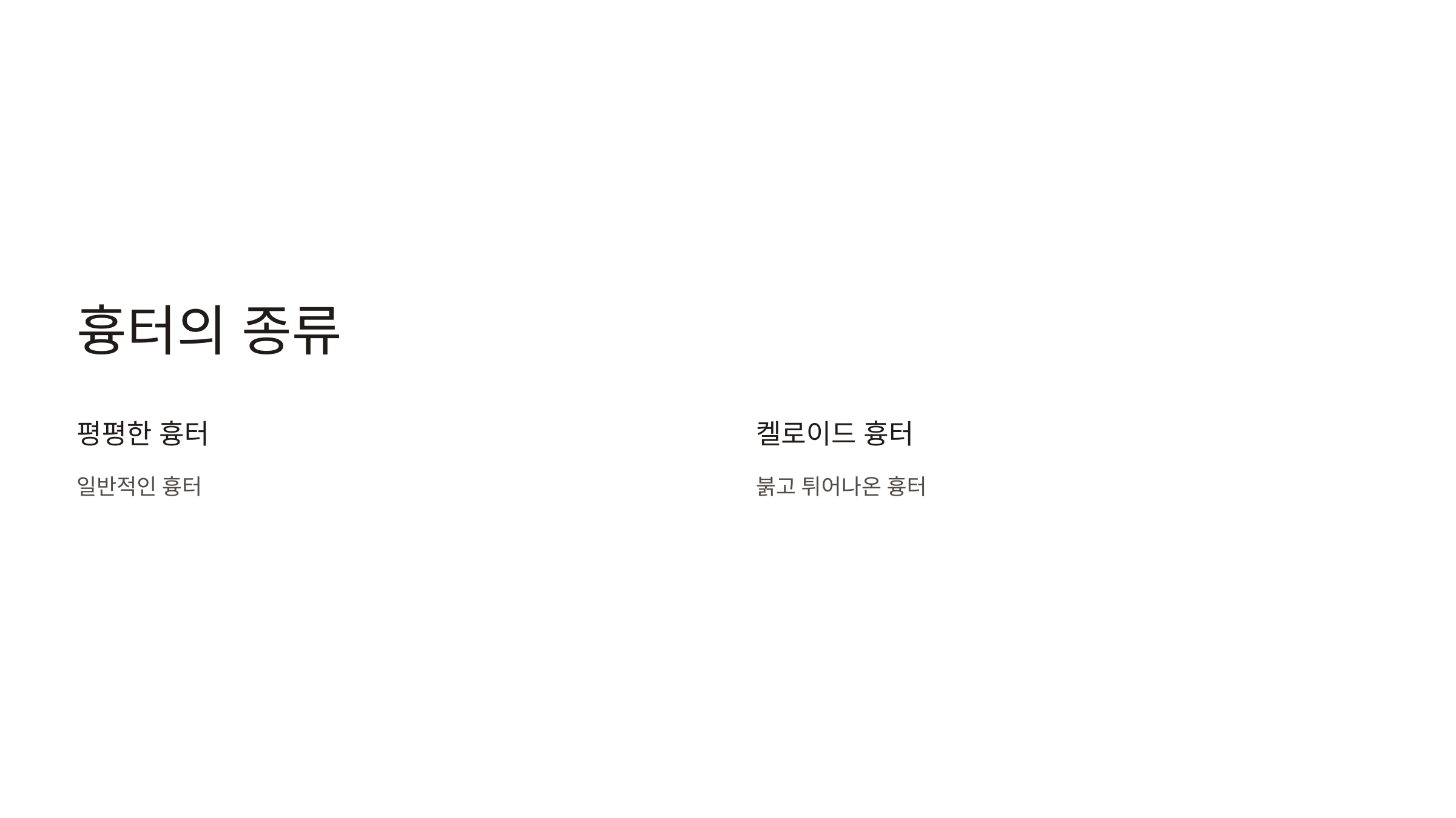 흉터의 종류로는 아래와 같은 것들이 있습니다: