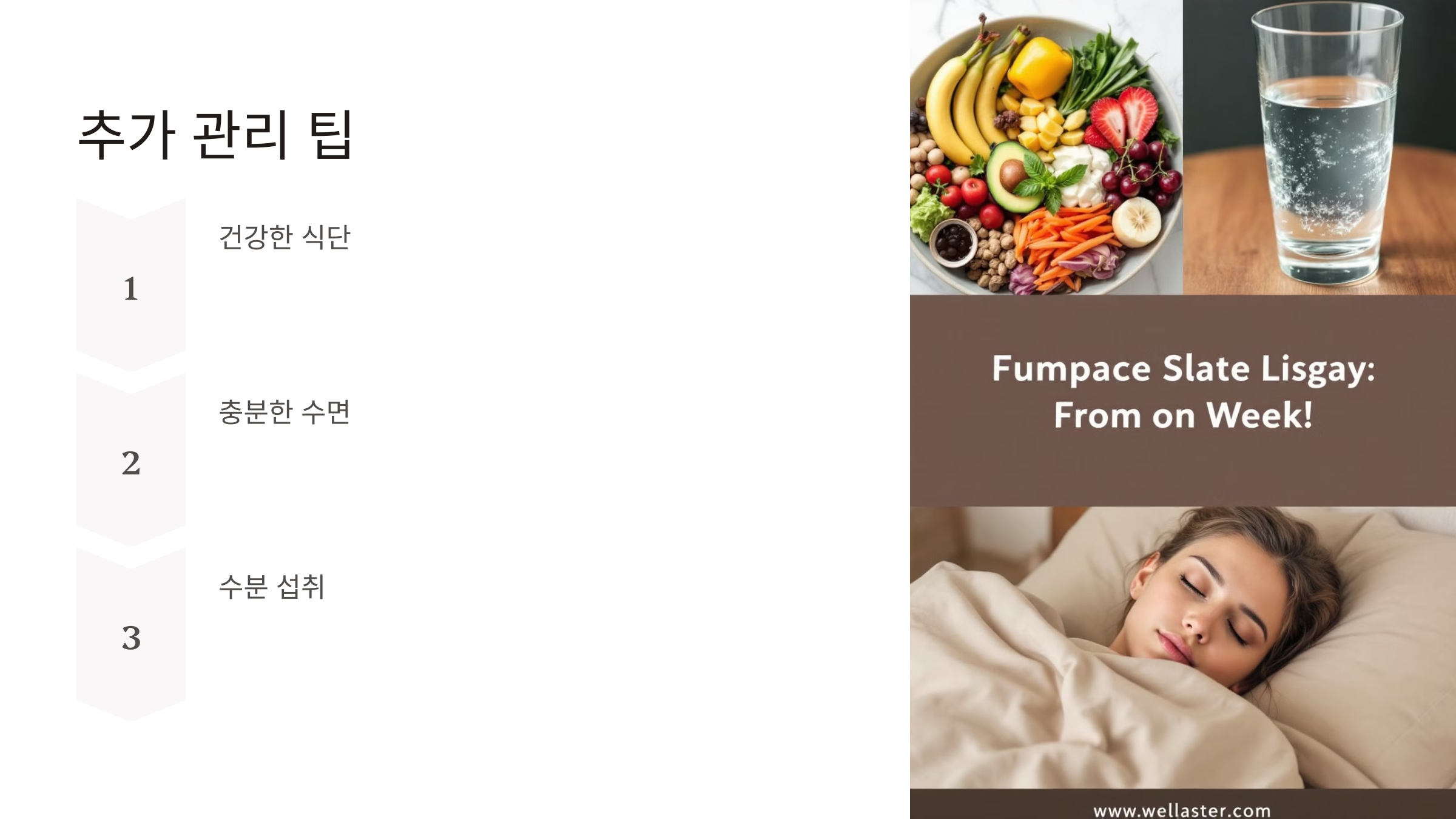 - 충분한 수면: 피부 회복에는 휴식이 필수입니다.