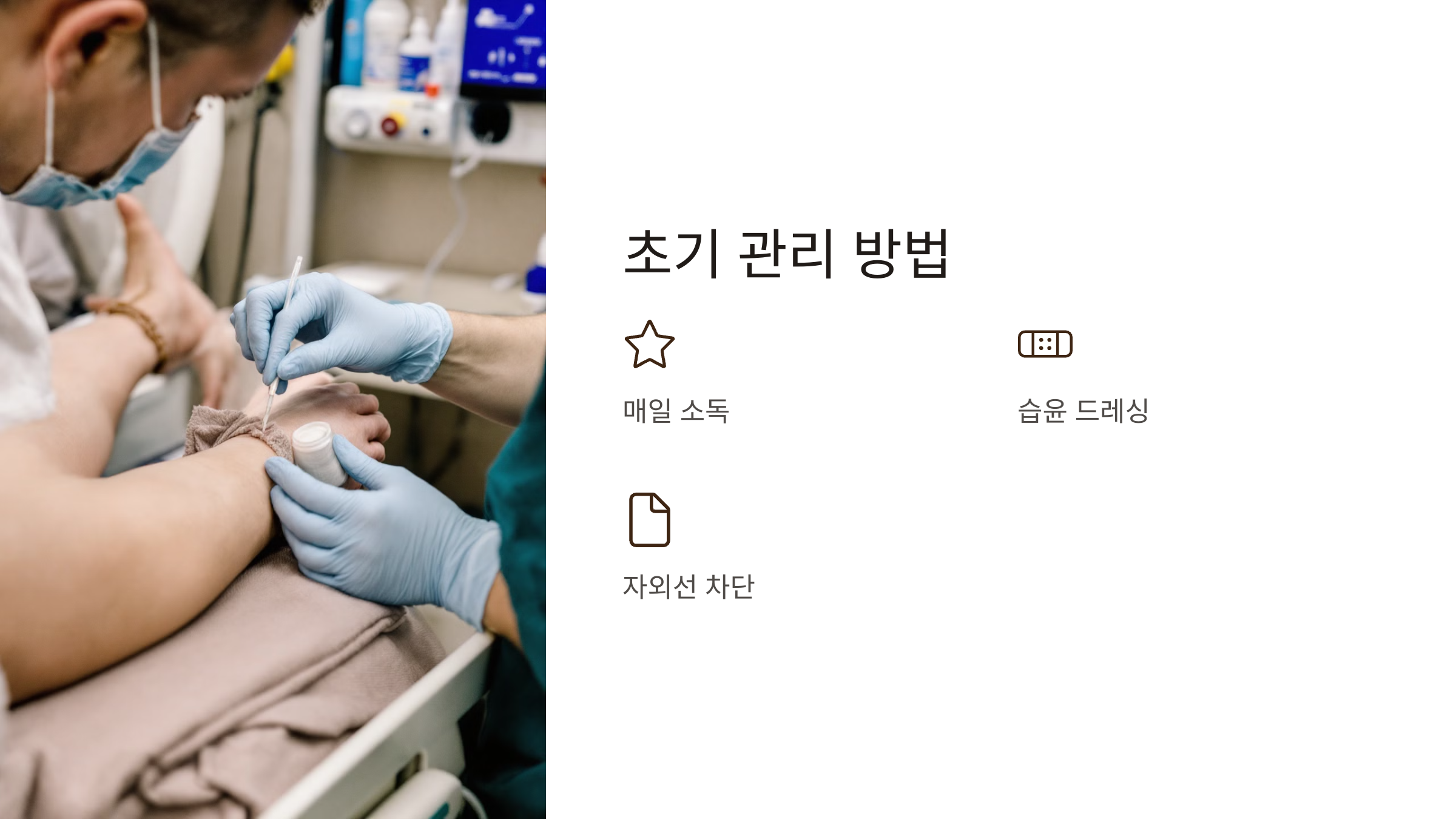 - 습윤 드레싱: 습기를 유지하면 상처 회복 속도가 빨라지고 흉터가 덜 생깁니다.