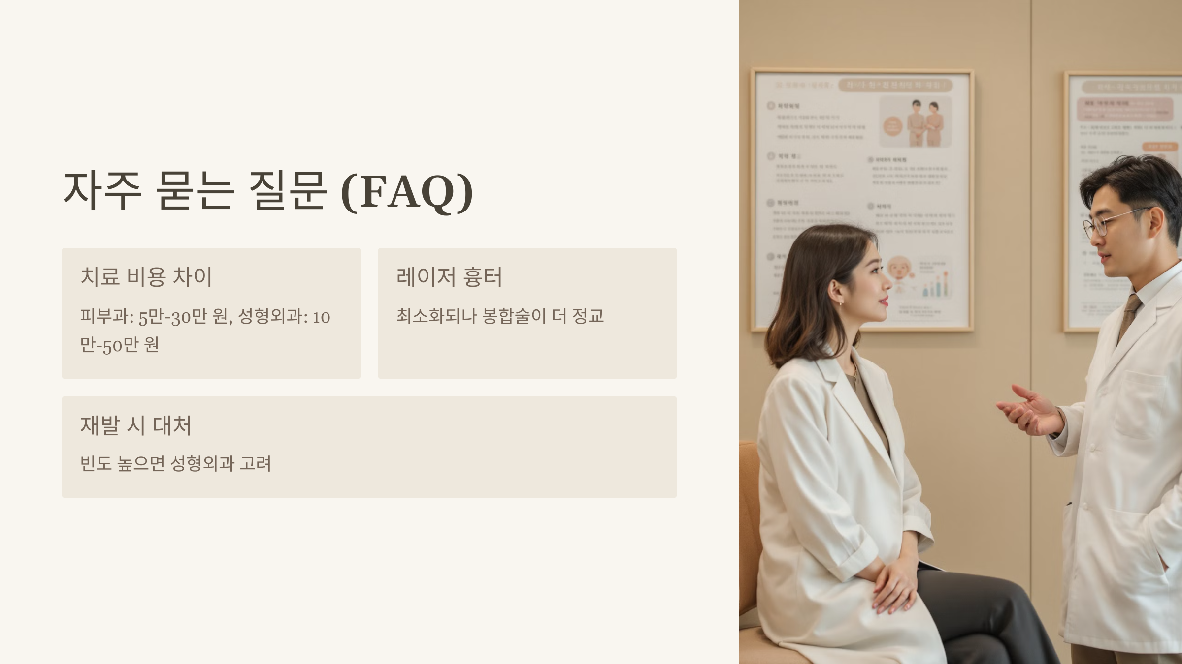 A2. 피부과 레이저는 흉터를 최소화하지만, 성형외과의 미세 봉합술이 더 정교한 결과를 제공합니다.