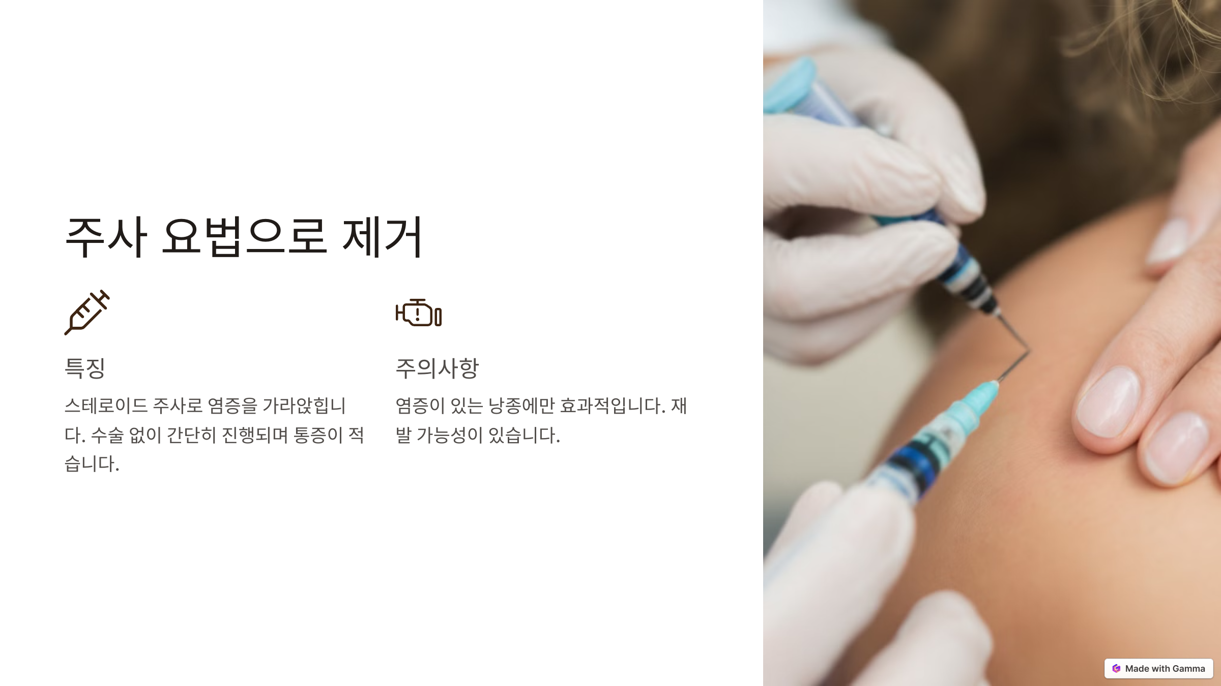 A2. 주사 요법은 염증을 완화시키는 데 효과적이지만, 낭종 벽이 제거되지 않아 재발 가능성이 있습니다.