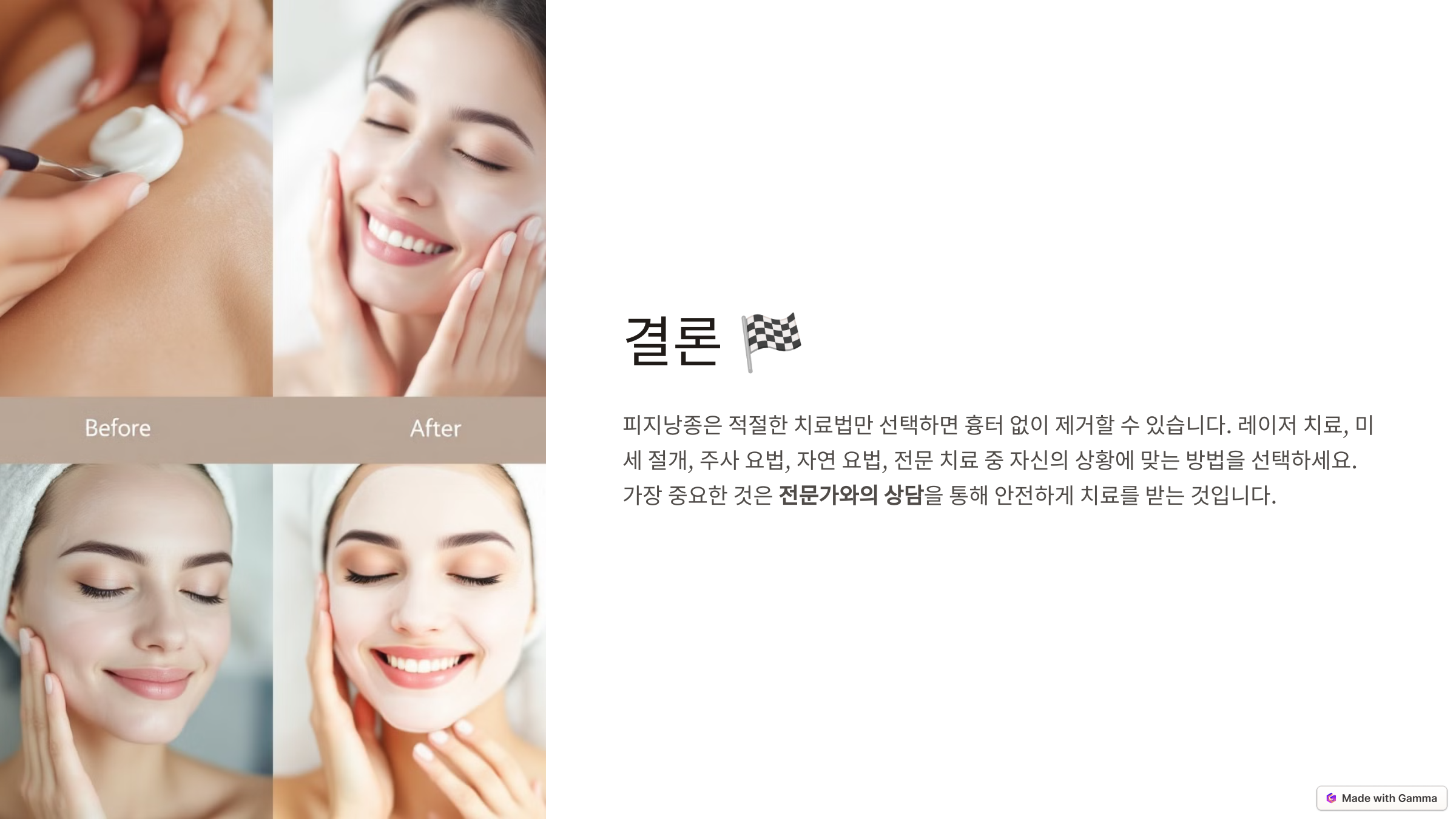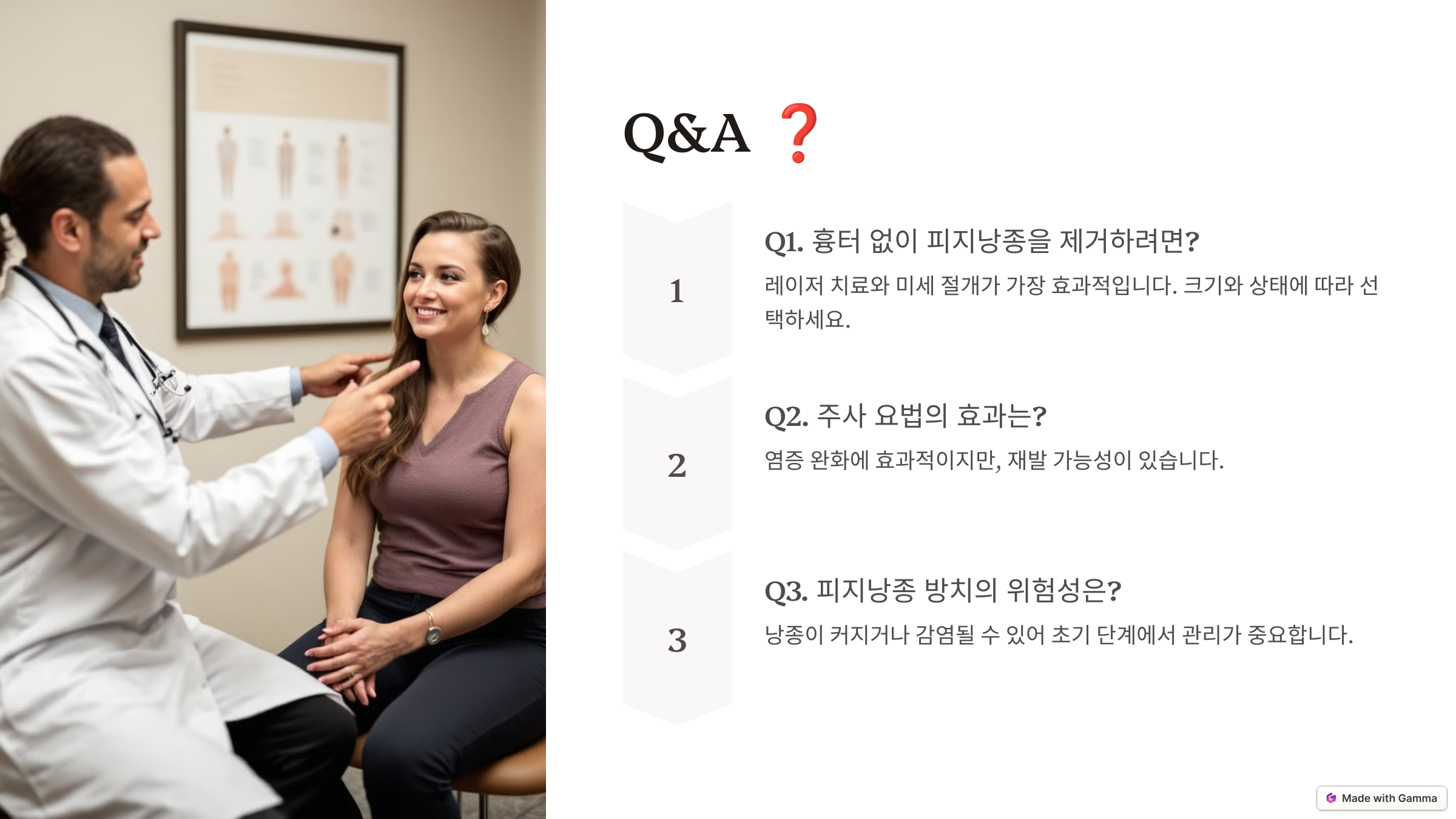 피지낭종은 적절한 치료법만 선택하면 흉터 없이 제거할 수 있습니다. 😊 레이저 치료, 미세 절개, 주사 요법, 자연 요법, 전문 치료 중 자신의 상황에 맞는 방법을 선택하세요. 가장 중요한 것은 전문가와의 상담을 통해 안전하게 치료를 받는 것입니다.