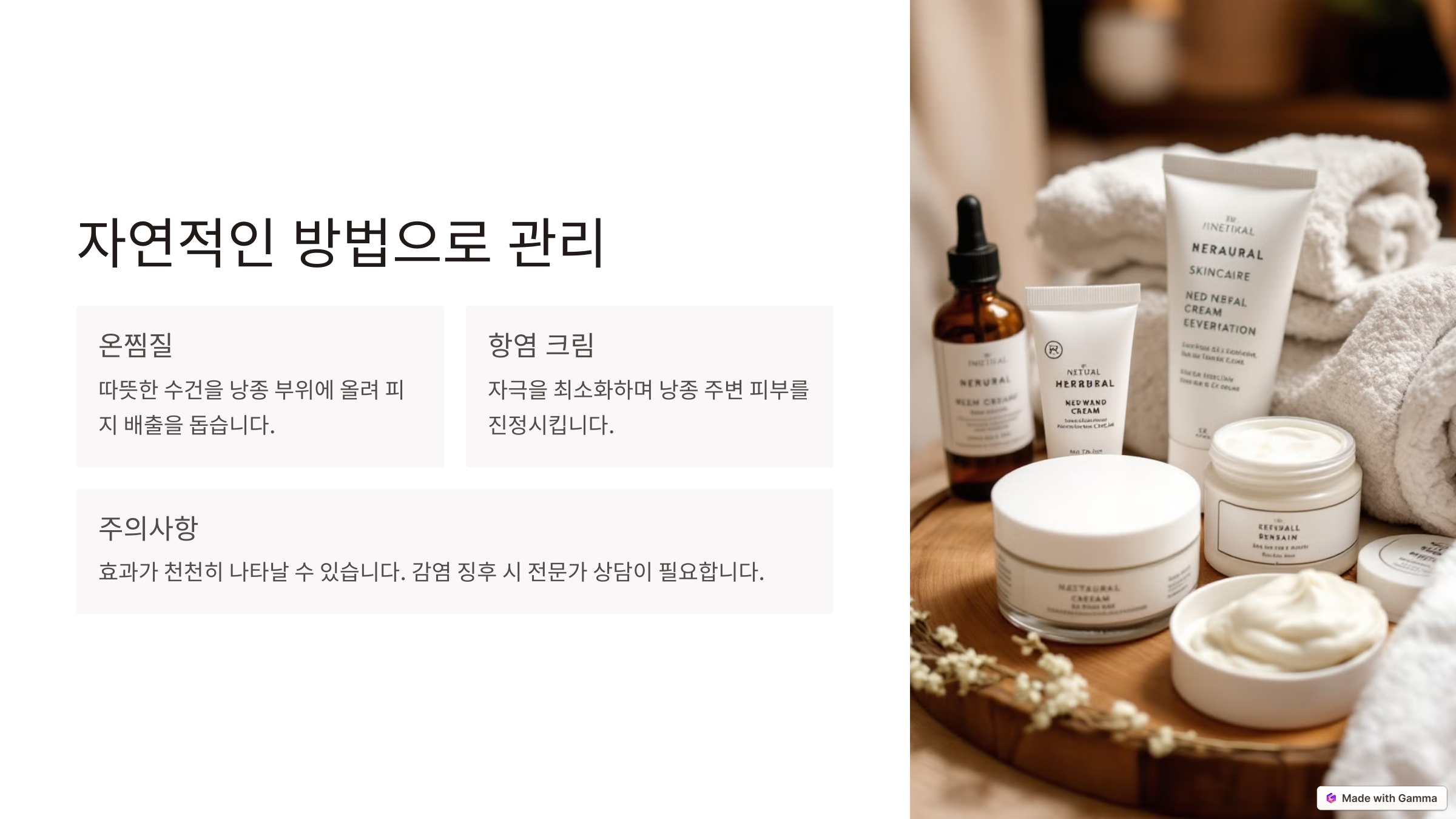 - 항염 크림: 자극을 최소화하며 낭종 주변 피부를 진정시킵니다.