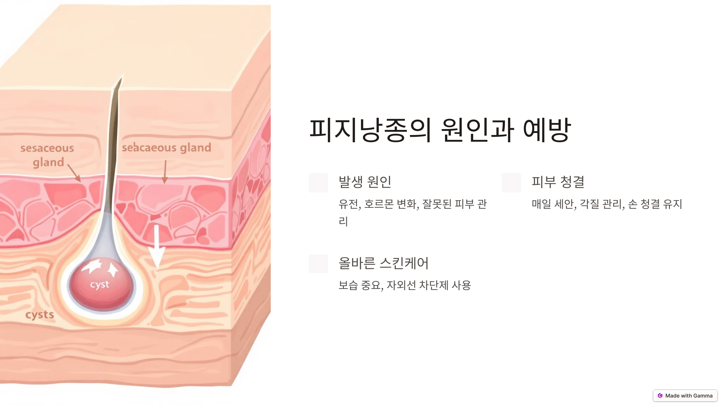피지낭종은 많은 분들이 한 번쯤 겪어본 피부 고민 중 하나입니다. 작은 혹처럼 보이지만, 관리가 소홀하면 재발할 가능성이 높아 큰 불편을 초래할 수 있어요. 이번 글에서는 피지낭종 재발 방지를 위한 실질적인 팁과 꼭 알아야 할 정보를 소개해 드릴게요! 이 글을 끝까지 읽으시면 재발 걱정을 줄이고 건강한 피부를 유지하는 데 큰 도움이 될 거예요. 😊